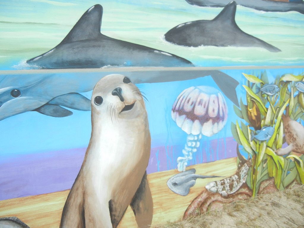 Centered in the mural is a Carpinteria Beach scene from yesteryear, inspired by a nostalgic postcard of the period and bearing the classic moniker “World’s Safest Beach.” This is surrounded by depictions of shore birds, pelicans, harbor seals, dolphins and egrets, all part of the extraordinary and diverse wildlife that enhances Carpinteria’s coastline.